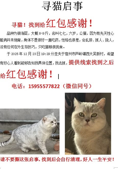 于2025年12月23日19:29分走失于宿州市芦岭镇西大吴新村,希望有好心人看到能够告知我具体位置,我去抓,提供线索找到之后必给🧧